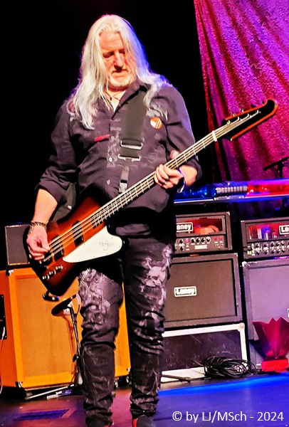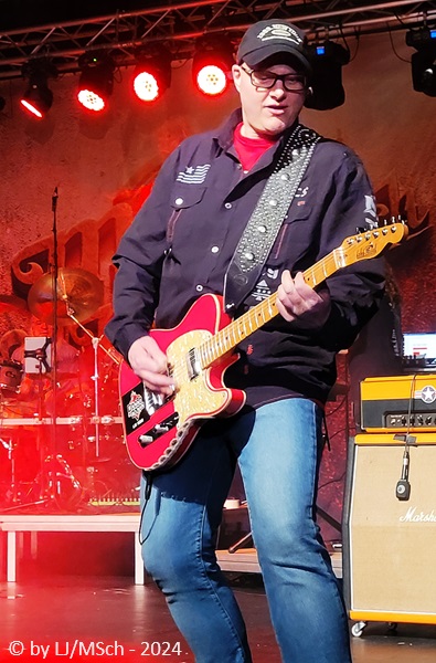 Von den ersten Tönen an überzeugten Marty und seine Mitstreiter auf ganzer Linie. Den Songtitel „The Time is now“ nahm Marty wörtlich. Hier und heute war der Zeitpunkt, um diese super Formation auf die Welt loszulassen. Marty beschränkte sich in seiner Rolle als Rhythmusgitarrist und ließ Pané in der Rolle des Gitarrenheros glänzen. Marty reiht sich mit seiner Zurücknahme in eine Reihe mit legendären Gitarrenhelden ein, die ebenfalls „nur“ Rhythmus spielen. John Lennon und Keith Richards sind jetzt nicht unbedingt die schlechtesten Vorbilder. Mit „Keep pushin‘ on“ feuerte die Band auch gleich die aktuelle Single des kommenden Albums auf die Gäste ab. Pané und Luppi merkte man ihren Status als erfahrene Musiker deutlich an. Nichts konnte sie erschüttern und sie schüttelten ihren Part locker aus dem Ärmel. Von Anfang an begleitete frenetischer Applaus den Auftritt. Jetzt möchte man fast meinen, dass Marty und seine Mitmusiker bereits jahrelang zusammenspielen. Aber weit gefehlt! Die erste gemeinsame Probe war nur drei (!) Tage zuvor erfolgt. Da stellt sich raus, wer was kann und wer nicht. Tja, hier konnten heute alle, und das auf das Allerbeste. Für einen Gänsehautmoment sorgte Dan Byrne, als er allein mit seiner Akustikgitarre seinen Song „Hemispheres“ zum Besten gab. Das komplette Set des Abends bestand fast ausschließlich aus Titeln vom kommenden Album. Lediglich „Walk a straight Line“ und „Demons“ stammten aus dem 2019er Album Walk a Straight Line. Zwischen den beiden älteren Songs durften Luppi und Pané solo zeigen, was sie auf dem Kasten haben. Nach dem rockigen „Don’t bother me“ durfte auch Carsten Enghardt sein Können einzeln vorführen. Tja … der Mann ist halt eine solide Bank. Ebenso auch Ian Edwards. Mit stoischer unerschütterlicher Ruhe bereitete er mit seinem Donnergrollen an den dicken Saiten die solide Basis. Nach der Powerballade „Deadwood“ kamen mit „Have Faith“ auch mal leisere Töne aus den Boxen. „Have Faith“ möchte man Marty laut zurufen … Glaub an dich … denn egal, ob Rock-Kracher oder Ballade – das Publikum im Kupferhaus bejubelte alles. Auch der eine oder andere Musiker von Alex Bender stand mittlerweile mitfeiernd im Publikum. Jetzt stand der eigentlich letzte Song der Show auf der Setlist. Wenn man wie Luppi sonst neben einer der größten Rockstimmen auf der Bühne steht, durfte natürlich ein Song nicht fehlen, den er sonst neben dem großen David Coverdale mit Whitesnake live performt, der aber bereits 1974 mit Deep Purple zu einem der größten Hits aus der Kehle von Coverdale wurde. Mit „Burn“ feuerten Marty and The Bad Punch eine Rockhymne der Extraklasse ins Kupferhaus ab. Die Stimmung konnte kaum besser sein. Ein sichtlich gerührter Marty konnte den nicht endenden Jubel kaum glauben. Nach ein paar Minuten ließen sich die Musiker wieder auf die Bühne zurück locken und sie feuerten ihre aktuelle Single „Keep pushin‘ on“ erneut auf die Menge ab.