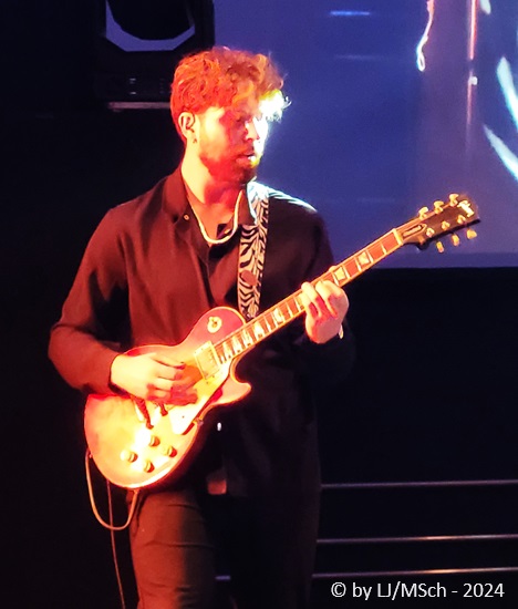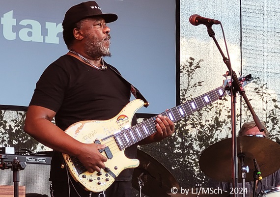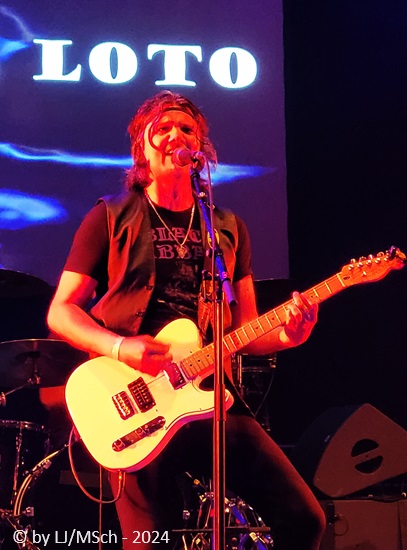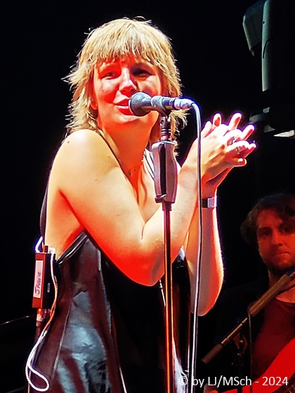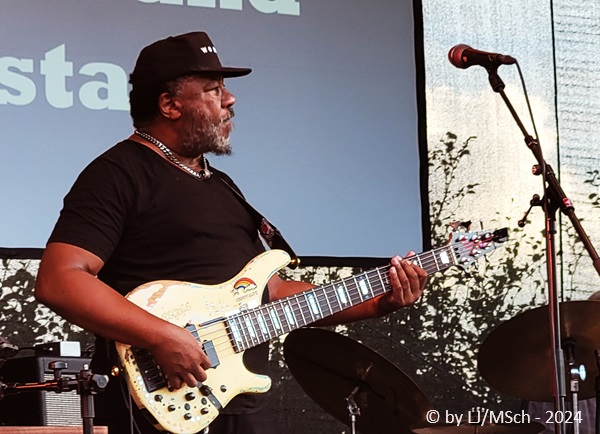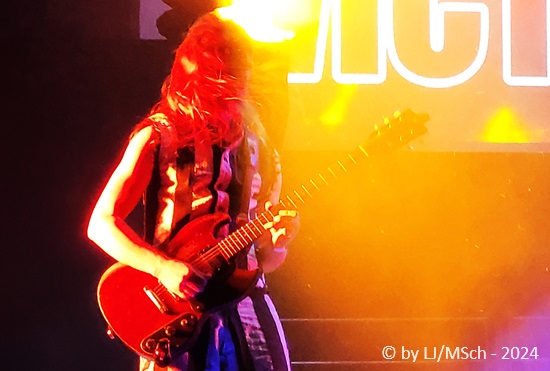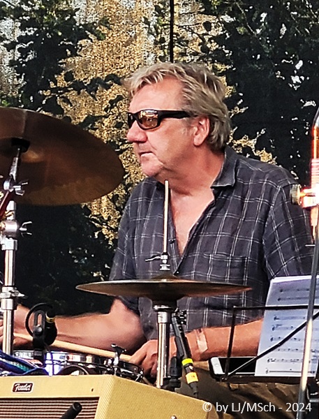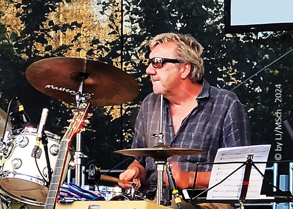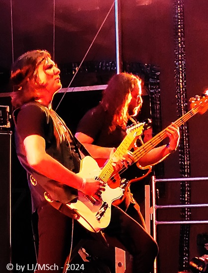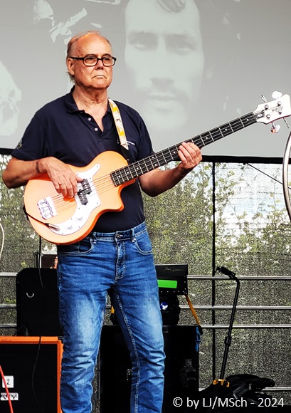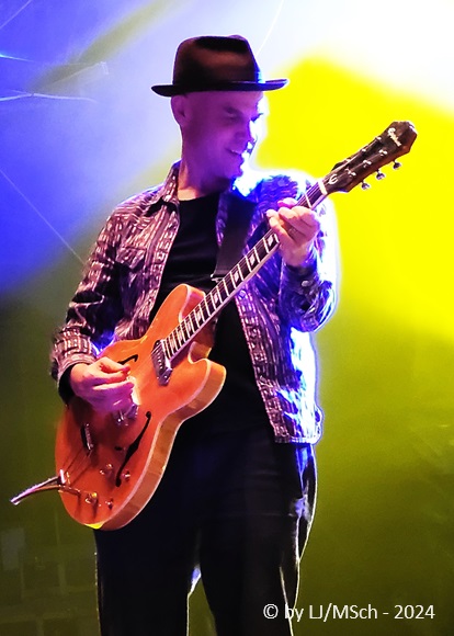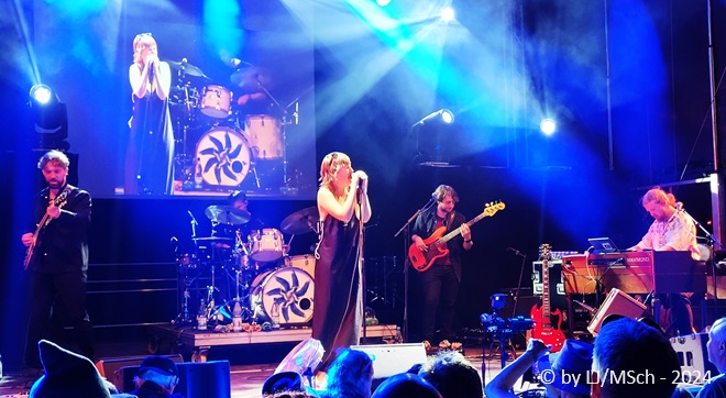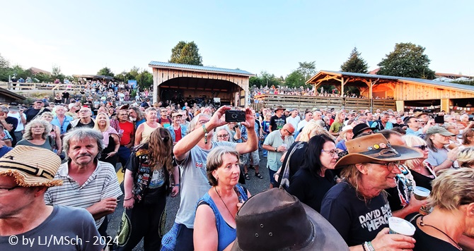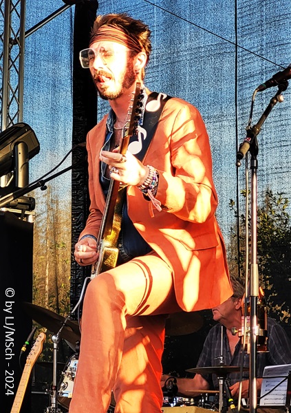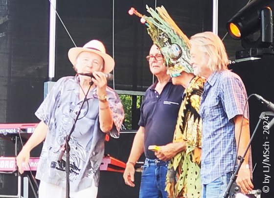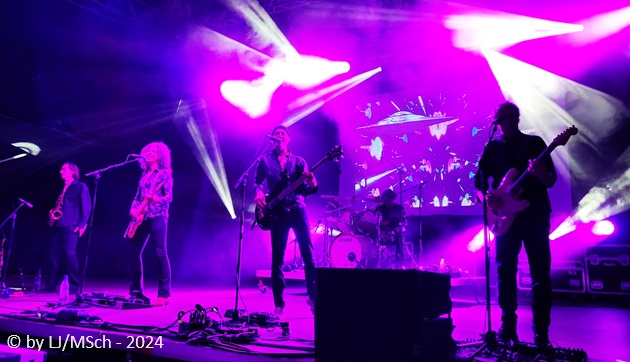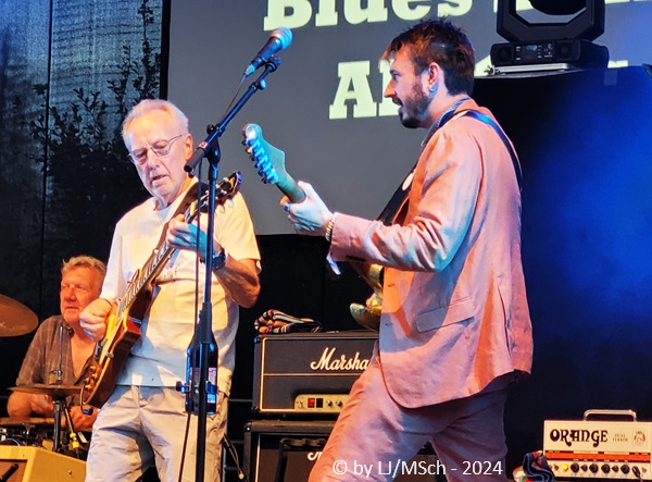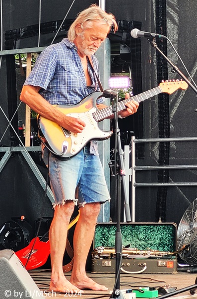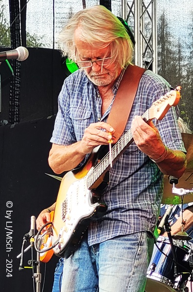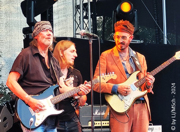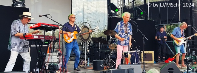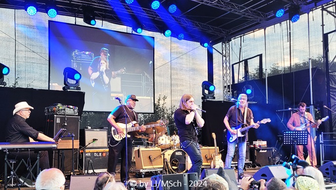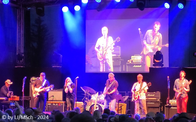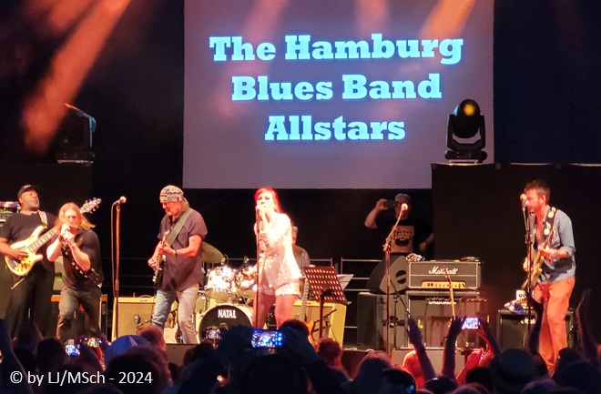 Um kurz nach Sieben wars dann endlich soweit. Aus den Lautsprechern an der Scheunenbühne erklangen die Töne eines Nebelhorns und das bekannte Intro „Auf der Reeperbahn nachts um halb Eins“ von Hans Albers gesungen, erklang. Die Stammtruppe der Hamburg Blues Band enterte die Stage, bestehend aus Bandchef Gert Lange an Gesang und Gitarre, Gitarren-Hexer Krissy Matthews an der Leadgitarre, Schlagzeuger Eddie Filipp, der seine Sticks schon für viele Größen der Musikwelt wirbeln ließ, unter anderem für Such a Surge, Hannes Wader oder Alex Conti nahm hinter seiner Schießbude Platz. Bass-Urgestein Reggie Worthy, der seinerzeit schon bei Ike and Tina Turner seine dicken Saiten bei „Nutbush City Limits“ zupfte oder den einen oder anderen Song für Ex-Animal Eric Burdon veredelte, war eigentlich schon ganz am Anfang der Hamburg Blues Band dabei. Krissie schaute optisch wie aus einem schlechten Pornofilm aus den Siebzigern aus. Stirnband, riesige Brille mit Kassengestell und zu guter Letzt goldglitzernde Stiefeletten zum orangefarbenen Anzug – voll pornös und stilecht der Gute. Als ersten Gastmusiker holte Gert Lange dann den Engländer Will Wilde an der Blues-Harp auf die Bühne. Und jetzt kam Schwung in die Bude. Wilde brachte gehörig Puste durch die Lamellen seiner Harmonicas und das passte wie Arsch auf Eimer zum Bluessound der HBB. Als ob er immer schon dabei gewesen wäre. In seiner Heimat UK wurde Wilde kürzlich bei den UK Blues Awards als „Instrumentalist des Jahres 2024“ nominiert und Größen wie Walter Trout loben ihn in den Himmel. Am hinteren Bühnenrand tauchte heimlich neben Drummer Filipp ein Groupie auf. Oberguru Mani Neumeier stand mit auf der Bühne und machte mit seinem Handy Bilder in Richtung Publikum. Nach ein paar Songs holte Gert dann den hessischen Organisten Frank Tischer auf die Bühne. Beheimatet Nähe der Wasserkuppe in der Rhön begleitete Tischer schon Größen wie die Miller Anderson Band oder die Spencer Davis Group. Bekannter ist sein Wirken und seine Konzerte im in einer alten Radarkuppel zu Hause auf dem Gipfel des höchsten Berges von Hessen, der Wasserkuppe in rund 1000 Metern Höhe. Dort, im Inneren der Kuppel (Das Radom), komponiert und produziert er seine Musik und tritt regelmäßig auf. Besucher werden dabei in Sphärische Klangwelten a la Tangerine Dream, Popol Vuh, Jean Michel Jarre oder Klaus Schulze entführt. Leider ging Tischer im Sound-Gefüge der Hamburg Blues Band etwas unter, zu dominant war die Blues-Harp von Wilde. Teilweise überlagerten sich die Tonspuren und es klang etwas matschig. Die Orgel war des Öfteren fast oder gar nicht zu hören. Als nächsten Gast holte Gert eine Musiklegende auf die Bühne. Bakerloo, Humble Pie oder Colosseum sind legendäre britische Bands, die Musikgeschichte schrieben. Gitarrist Clem Clempson, der seit zig Jahren immer mal wieder auf Touren der HBB dabei ist. Clempson an der Gitarre ist ein Musiker, der Seele und Technik vereint, einer der besten Bluesgitarristen aller Zeiten. Lange verschwand dann einige Male von der Bühne und überließ Clem den Platz im Rampenlicht. Leider wurde der performte Blues trotz der Brillanz von Clempson manchmal etwas langatmig für die Besucher und wir hörten einige Missfallensbekundungen im Publikum. „Das dauert zu lang“, „langweilig“ oder „eintönig“ meinten einige Gäste. Bassist Reggie Worthy stand meines Erachtens auch nicht mit der selben Spiellaune auf der Bühne, wie ich ihn schon einige Male erlebt hatte. Zwischenzeitlich wirkte er sogar etwas lustlos. Zwischendrin durfte er ein wenig glänzen, als er den Riesenhit „Nutbush City Limits“ von Tina Turner spielte und dabei die Vocals übernahm, muss aber sagen, dass das auch etwas runtergerattert rüberkam. Irgendwie waren die Hamburg Blues Band Allstars nicht so recht eine Einheit und ihr Auftritt kam mir vor wie mit gebremstem Schaum gespielt. Manche Passagen plätscherten etwas lieblos dahin. Als Ersatz für Inga Rumpf musste die Norwegerin Heidi Solheim, Sängerin bei der norwegischen Classic-Rock Band Pristine herhalten. Was hörten wir für Vorschusslorbeeren über diese Sängerin … aber das Fazit gleich vorweg: Ojemine, das war nix! Aufgedonnert im silbrig/weißen Paillettenkostümchen fegte der rotschopfige Wirbelwind Heidi mächtig über die Bühne und legte sich stimmlich sehr ins Zeug. Ihre Röhre war in keiner Weise schlecht, aber passte halt leider so gar nicht zum erdigen Blues der Hamburg Blues Band. Ihre Stimme klingt modern, was aber der Sound der HBB beileibe nicht ist. Mir kam ihr ganzer Auftritt so vor, als dass da ein Fremdkörper mit auf der Bühne steht. In einer modernen Bluesrock Band passt ihre Stimme zu 100% ins Gesamte. Ich kann mir sehr gut vorstellen, Solheim als Sängerin in der Krissy Matthews Band zu hören, aber eben nicht bei den alten Dackeln der Hamburger. Auch optisch wirkte sie durch ihr Bling-Bling-Kostümchen viel zu schrill und aufgesetzt. Der etwas matschige Gesamteindruck der HBB-Allstars verstärkte sich dadurch leider noch mehr und wir verließen noch vor den Zugaben den Platz. Der Funke sprang heute einfach nicht über. An diesem Abend fehlten Ansagen und das Zusammenspiel mit dem Publikum. Auch die Abwesenheit von Inga Rumpf wurde einfach stillschweigend übergangen. Ich kenne Gert Lange und seine Truppe gut 30 Jahre, war auf zig Konzerten dabei, in egal welcher Besetzung und bisher war ich immer komplett begeistert. Leider muss ich feststellen, dass dieser Auftritt ihr bisher schlechtester war, den ich live miterlebt habe. Für mich persönlich sehr schade. (Galeriebilder anklicken)