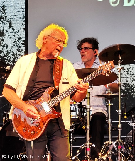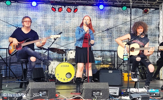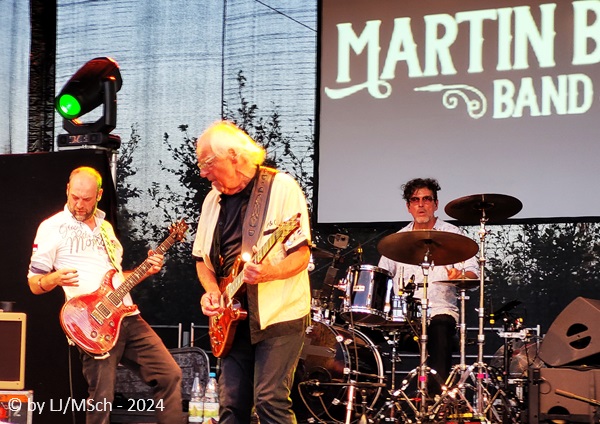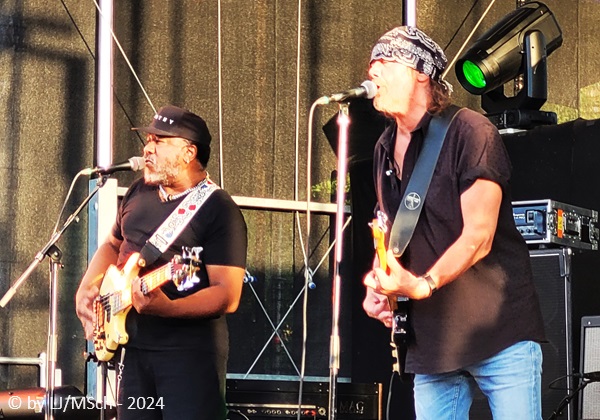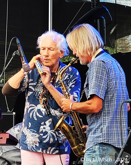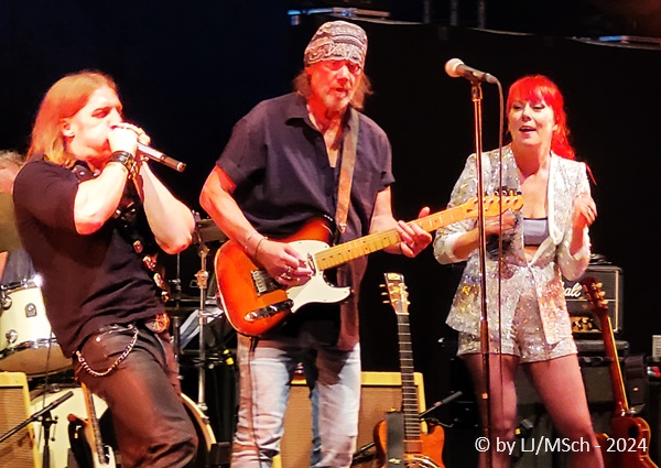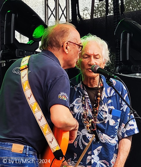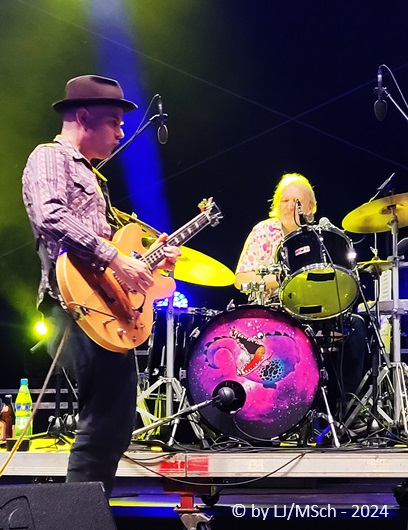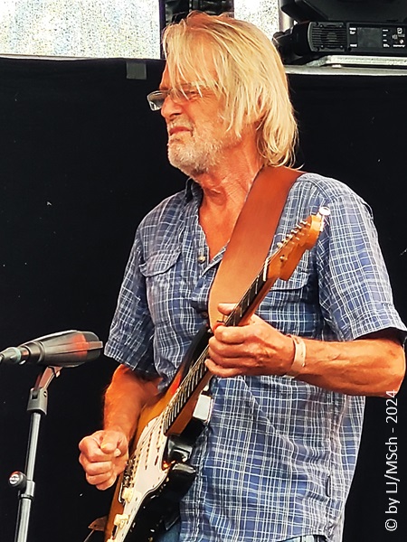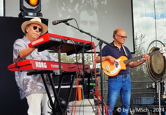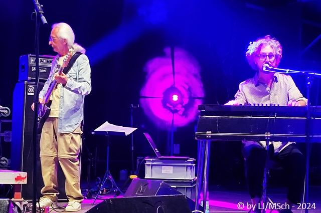 Der Samstag stand für uns eigentlich ganz im Schatten der Hamburg Blues Band Allstars. Obwohl Inga Rumpf abgesagt hatte, waren wir gespannt, wen Bandleader Gert Lange dieses Mal wieder dabei hatte. Ich hatte die HBB in den fast 30 Jahren seit ich sie kenne in zig verschiedenen Besetzung live erlebt. Gert hat die Gabe, immer wieder die größten Namen der Musikwelt in die Band zu integrieren oder als Gäste dabei zu haben. Dick Heckstall-Smith (Graham Bond, Blues Incorporated, Bluesbreakers, Colosseum), Pete Brown (Cream), Maggie Bell (Stone the Crows), Clem Clempson (Bakerloo, Humble Pie, Colosseum), Arthur Brown (Kingdom Come), Brian Auger, Miller Anderson (Keef Hartley Band, Spencer Davis Group), Hans Wallbaum (Curly Curve, Interzone), Bexi Becker (Lake, Spooky Tooth), Geoff Whitehorn (Roger Chapman, Bad Company, Procol Harum), Mike Harrison (Art, Spooky Tooth), Ingo Bischof (Kraan, Guru Guru, Karthago), Adrian Askew (Atlantis, Lucifers Friend), Chris Farlowe (Atomic Rooster, Colosseum), Micky Moody (Juicy Lucy, Whitesnake, Tramline, Snafu) … Allesamt sehr große bekannte Namen aus der Musikwelt … und Gert versammelte sie alle in seiner Band. Am Nachmittag stand eine Band auf dem Programm, deren Gründer und Hauptperson ich seit bereits 40 Jahren kenne und schätze und die ich mir immer und immer wieder live anschaue, wenn sie in meiner Reichweite spielen. Wir kamen also bereits im 14:30 Uhr am Festivalgelände an und konnten die letzten zwei Songs von Melanie Mau & Martin Schnella, einem Trio aus Gesang, Gitarre und Bass bestehend noch live erleben, die diese auf der ersten vorgelagerten Liftbühne performten. Ihr akustischer Mix aus Prog und Folk wusste auch einige hundert Zuhörer vor der Bühne zu begeistern.