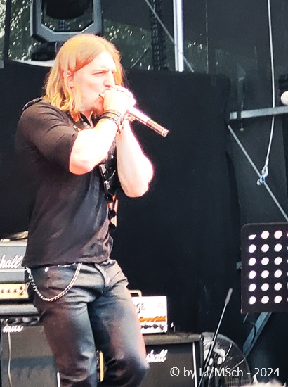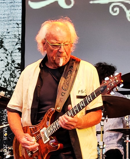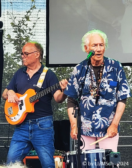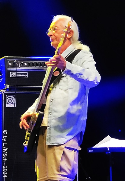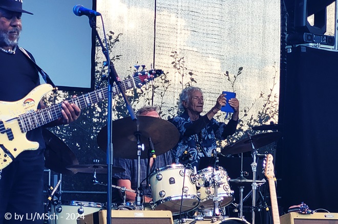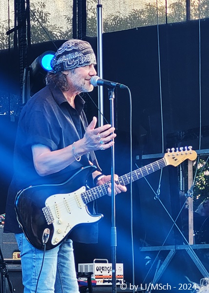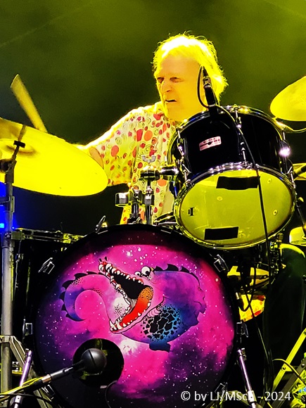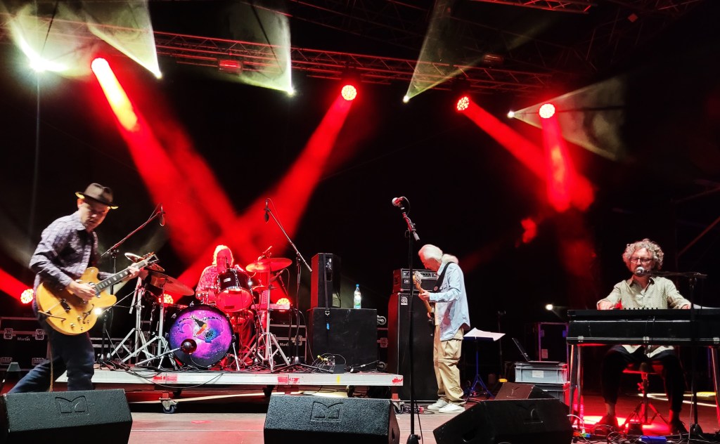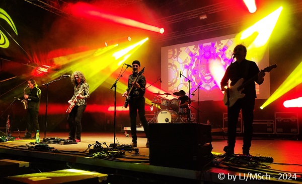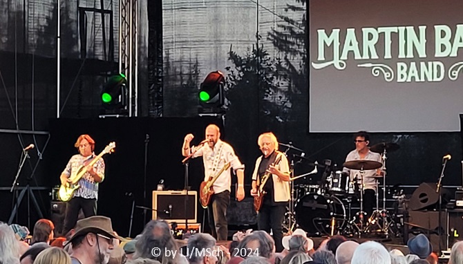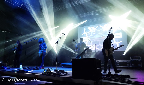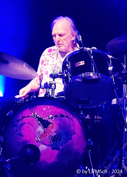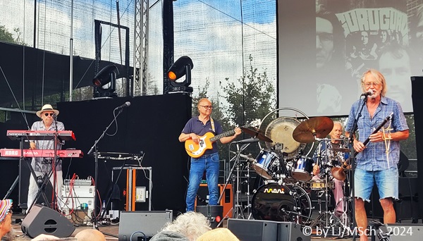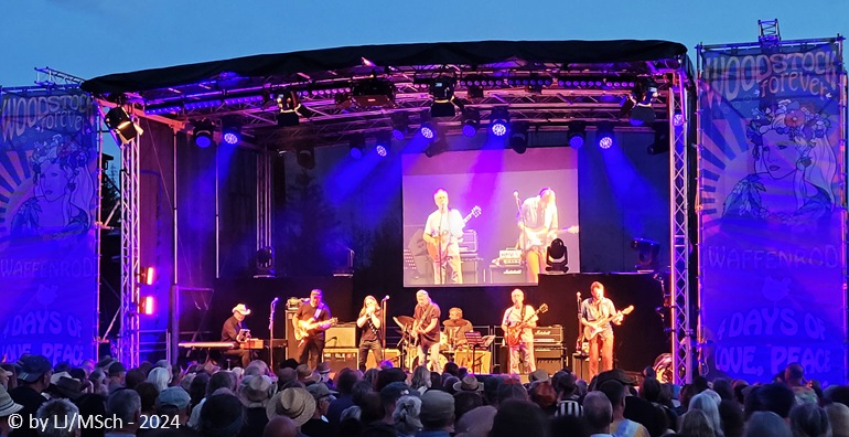 Jetzt um 22:00 Uhr kam einer der Gründe auf die Waldbühne, die den Besuch vom Woodstock Forever für mich zu einem Erlebnis machten. Die Schweizer Musiklegende Krokodil mit ihrem Progressivrock, der trotz Schweiz zum deutschen Krautrock gezählt wird. Trommlerlegende Düde Dürst, der in den Swinging Sixties seine Drumsticks schon für die legendären Les Sauterelles wirbeln ließ, war neben Bassist Terry Stevens seit Anbeginn der Krokodile immer noch dabei. Komplettiert werden die beiden Legenden seit 2020 von Gitarrist und Lead-Sänger Adrian „Adi“ Weyermann und Keyboarder Erich Strebel, der auch die Background beisteuert. Krokodil hatten sich seit ihrer Reunion nicht nur auf alten Lorbeeren ausgeruht, sondern brachten seitdem drei neue Alben auf den Markt. Eine komplette Neueinspielung ihres dritten Albums, ein Studioalbum und zum Record Store Day 2024 eine Live-Doppel-LP standen zu Buche. Ihre Setlist war eine ausgewogene Mischung aus alt und neu und wusste die Leute vor der Bühne zu begeistern. Der Schweizer Vierer wurde stark abgefeiert. Besonders zwei Coverversionen ihrer großen Vorbilder wussten zu begeistern – „Tomorrow never knows“ und „Dear Prudence“ von den Beatles. Dürsts alte Band Les Sauterelles wurden seinerzeit auch als die Swiss Beatles bezeichnet. Der letzte reguläre Song der Setlist, „You’re still a Part of me“ brachte die Leute zum Mitsingen. Als Zugabe musste natürlich das unvermeidliche „Morning Dew“ dargeboten werden. Ebenfalls wieder eine Coverversion aus der Feder von Tim Rose und wie schon der Song davor auf ihrem 1969er Erstlingswerk enthalten. Gut 95 Minuten dauerte ihr Set und eine Menge Leute und Fans ließen sich anschließend alles mögliche am Merch-Stand von den Krokodilen signieren. (Galeriebilder anklicken)