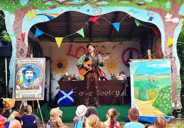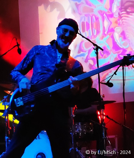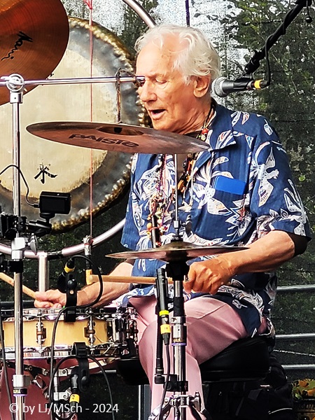Mitten am Nachmittag kam jetzt eine Legende auf die Scheunenbühne. Der Schamane aus dem Odenwald Mani Neumeier stand jetzt mit seiner unverwüstlichen Jazz-Kraut-Progrock-Underground Gruppe Guru Guru auf dem Programm. Die Vorreiter der deutschen Weltmusik waren seit jeher ein Garant für begeisterten Sound, der die Leute mitreißen konnte, vor allem wenn Neumeier als Elektrolurch maskiert performt. Ich kenne den Mani schon seit den frühen Achtzigern und hab ihn mindestens schon an die 20 mal live gesehen und muss sagen, auch beim nächsten Auftritt wird es keine Sekunde langweilig. Begleitet wird er von seinen alten Weggefährten Roland Schaeffer (Ex-Brainstorm) an Gitarre und arabischer Tröte, und Peter Kühmstedt (Ex-Aera) am Bass. Beide spielen schon seit 1976 beziehungsweise 1977 bei Guru Guru. Zwischen 1988 und 2016 spielte der Mannheimer Hans Reffert (Ex-Flute and Voice, Zauberfinger) die Gitarre bei Guru Guru. Als Reffert im Februar 2016 von uns ging, übernahm dessen alter Musikspezl Jan Lindquist (Ex-Zauberfinger) die Gitarrenrolle neben Roland Schaeffer für die nächsten vier Jahre. Der wurde dann 2020 abgelöst von Zeus B. Held, dem ehemaligen Keyboarder von Birth Control, Touch und Gina X. War der Guru Guru Sound vorher ziemlich gitarrenlastig angelegt, brachte Held mit seinen Keyboards einen völlig neuen Touch mit in die Band, was dem Sound sichtlich gut tat. Jetzt stand also der Vierer auf der Bühne, der seit vier Jahren die Menge überall zu begeistern wusste. Mani und seine Freunde hatten wir erst noch vor kurzem in Freising live gesehen. Wir hatten uns schon vor dem Auftritt gesehen und begrüßt. Mit Schaeffer hatte ich auch noch eine ausgiebige Unterhaltung über Schlangen und ihre Haltung, im Laufe derer ich mich über sein Interesse sehr freute. Wir halten rein zufällig einige Schlangen in unserem Haushalt. Mani und seine Mannen wussten mit einer ausgewogenen Mischung aus alten und neuen Songs wie bei jedem Auftritt die Menge zu begeistern. Songs wie „Living in the Woods“, bei dem Mani Neumeier mit seiner Stand-Tom direkt am vorderen Bühnenrand trommelt, kennt man wie auch „Izmiz“, „Iddli Killer (East)“ oder „Space Baby“ bereits seit gut 30 Jahren von der Setlist – moderne Klassiker sozusagen. Für die abertausenden von Hippies war Neumeier mit seiner Truppe natürlich die perfekte musikalische Begleitung an einem schönen Nachmittag. Spätestens als Peter Kühmstedt aber die weltbekannten Basstöne vom größten Hit der Truppe anstimmte und Mani Neumeier als Elektrolurch maskiert auf der Bühne stand, tobte die Menge begeistert. „Gestatten, hier spricht der Elektrolurch“ – „Volt, Watt, Ampere, Ohm – ohne mich gibt’s keinen Strom“. Eigentlich wohnt Lurchi ja im Odenwald in der Lüsterklemme neben dem Hauptzähler, aber egal wo Lurchi losgelassen wird, er sorgt jedes Mal für Begeisterungsstürme, und so auch hier. Nach gut 90 Minuten wurden Guru Guru begeistert von der Bühne verabschiedet. Mani Neumeier war wie seine liebe Frau Etsuko und auch Zeus B. Held anschließend noch auf dem Festivalgelände unterwegs und schauten sich andere Auftritte an. (Galeriebilder anklicken)