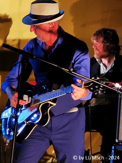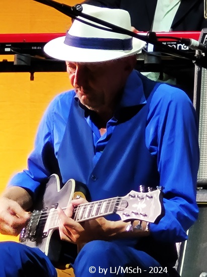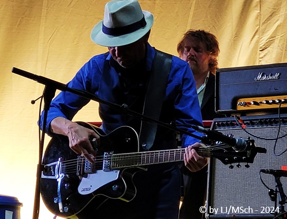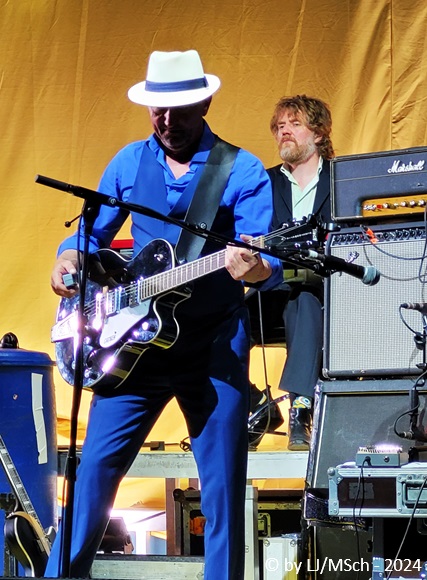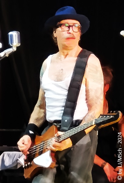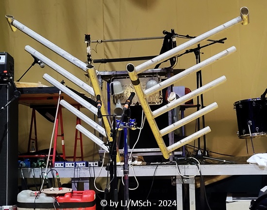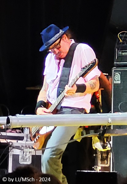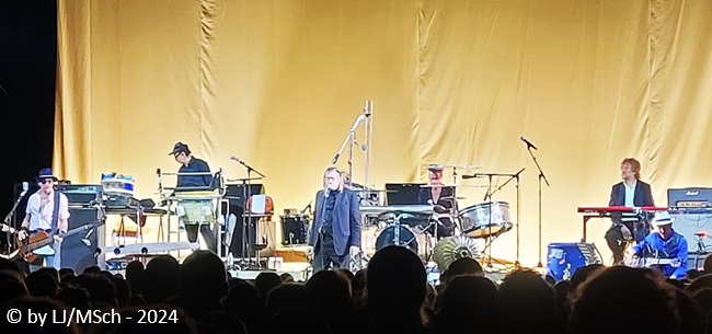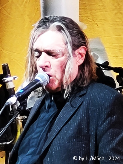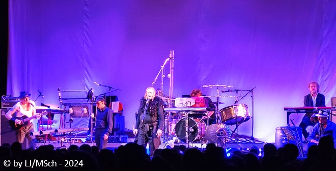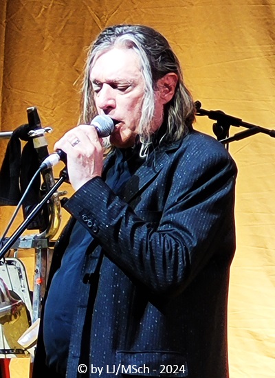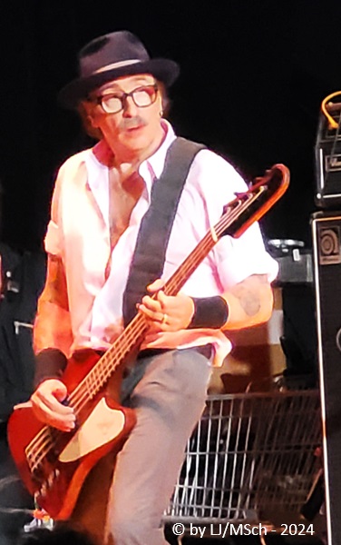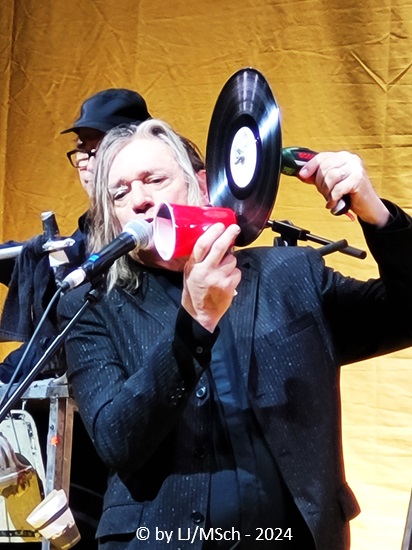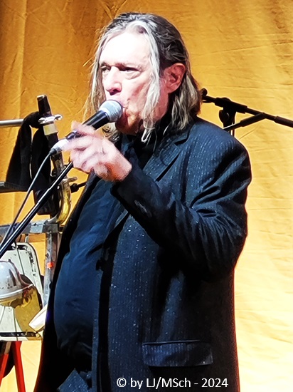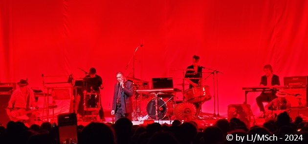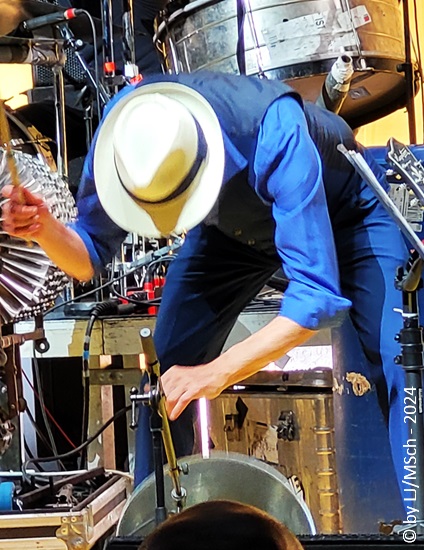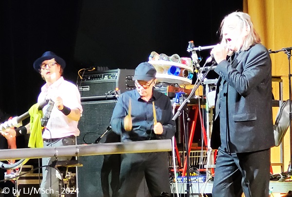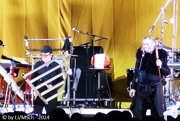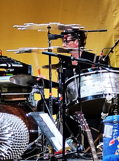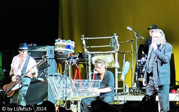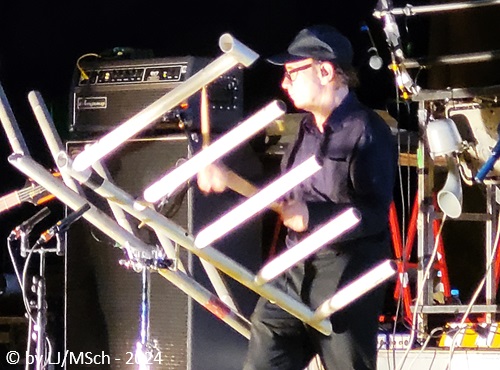 Blixa Bargeld, bürgerlich auf den Namen Hans-Christian Emmerich getauft und ganz nebenbei auch noch Mitgründer von Nick Cave And The Bad Seeds wurde neben Bassist Alexander Hacke am meisten bejubelt. Die Bühne, gerammelt vollgestellt mit allerlei Sammelsurium und Gerümpel zur Tonerzeugung, sah aus wie ein Schrottplatz. Gründungsmitglied und Schlagzeuger Andrew Chudy, besser bekannt als N.U. Unruh musste Anfang der 80er Jahre sein Drumkit aus einer finanziellen Notlage heraus verkaufen und machte aus einer Not eine Tugend. Aus zusammengewürfeltem Schrott und Alltagsgegenständen wurde ein Instrumentarium konzipiert, mit dem sie (laut Wikipedia) „ihre apokalyptische Sicht der Welt inszenieren„. Komplettiert wurde die Band vom zweiten Perkussionisten Rudi Moser und dem Gitarristen Jochen Arbeit, beide seit 1997 bei den Neubauten, und Keyboarder Felix Gebhard, der die Band live seit 2014 unterstützt. Der Großteil der Setlist wurde aus den letzten beiden Alben Alles in Allem von 2020 und dem aktuellen Rampen – APM: Alien Pop Musik von 2024 bestritten.