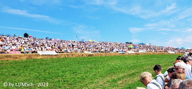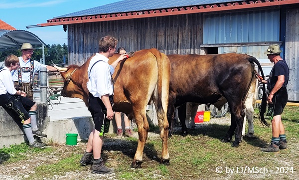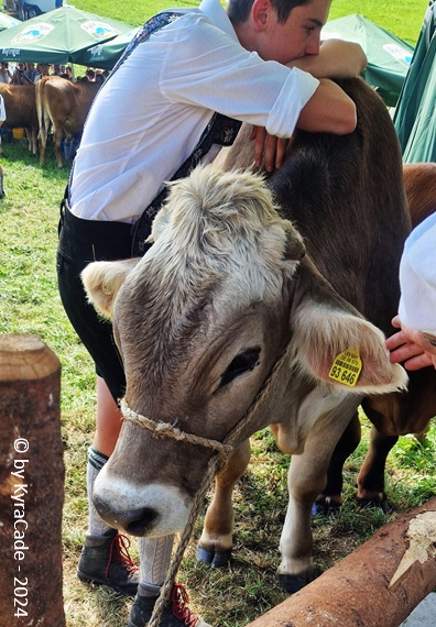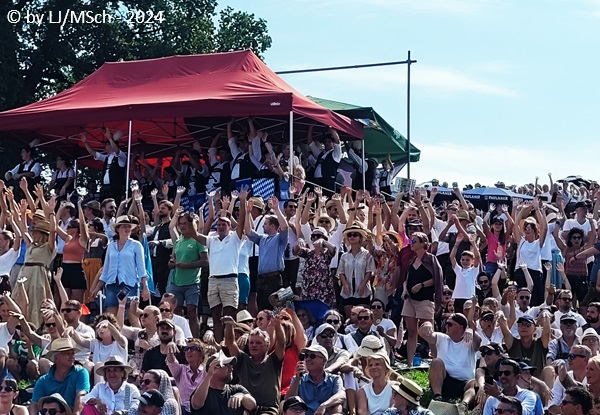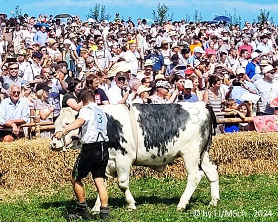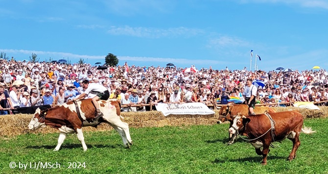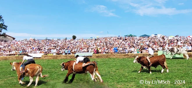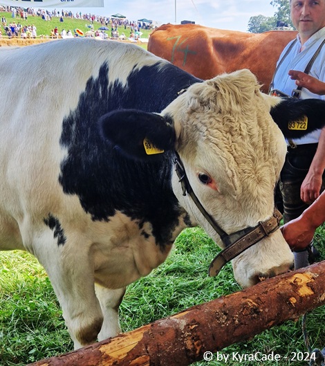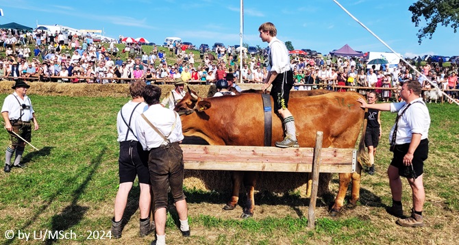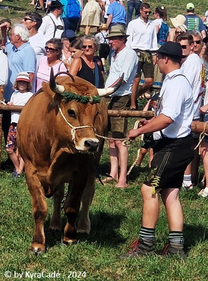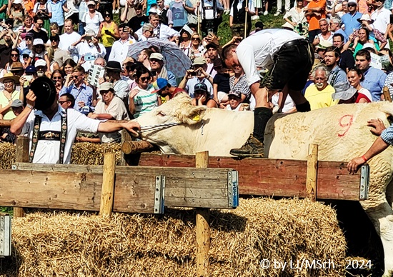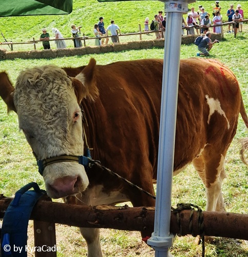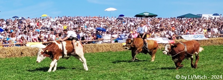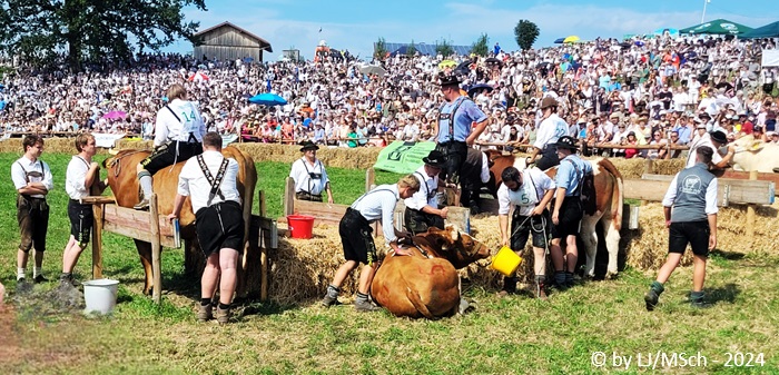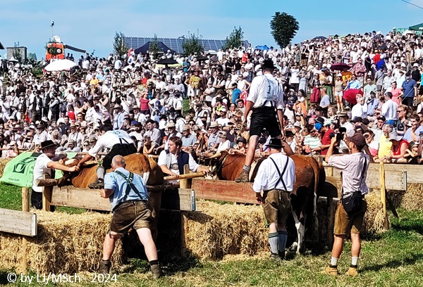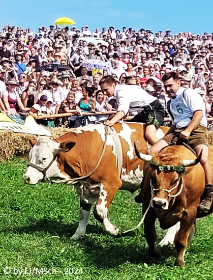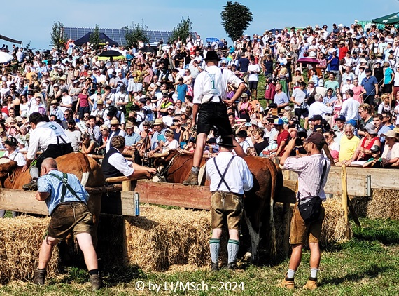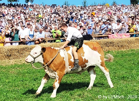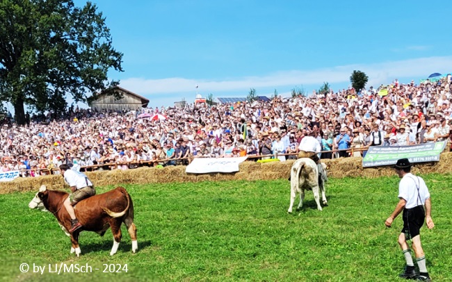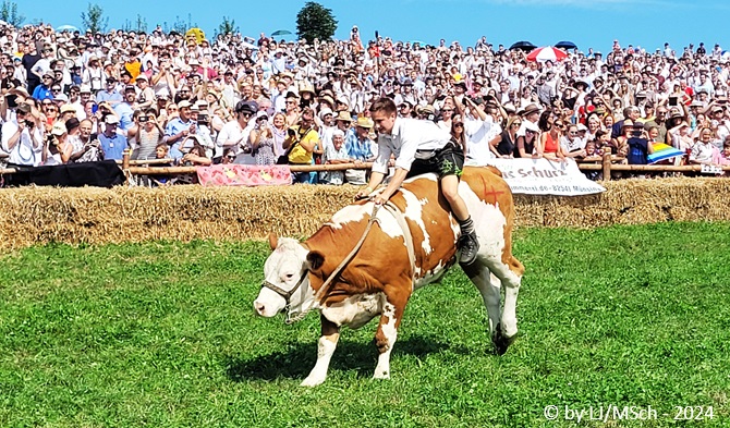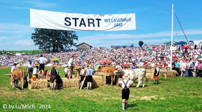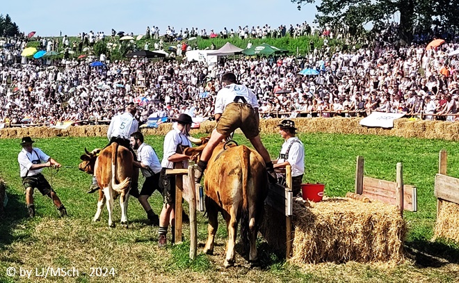 Ochsenrennen … da werden jetzt gleich wieder die militanten Tierschützer aufgeschrien haben, denen sei aber gesagt: Ein Ochse ist seit jeher ein Arbeitstier, welches früher Lasten von einigen hundert Kilos ziehen musste. Ein Jockey der vielleicht gar mal 80 Kilo auf die Waage bringt juckt die gar nicht. Ausserdem wurde die Veranstaltung tierärztlich begleitet vom Veterinäramt Bad Tölz, welches beim geringsten Anzeichen von Tierquälerei sofort und zurecht eingeschritten wäre, und als wichtigsten Punkt muss der Ochse alles freiwillig mitmachen. Wenn ein Ochse nicht mehr will, dann will er eben nicht mehr – Punkt. Da passt der Begriff vom „sturen Ochsen“ perfekt. Mittlerweile waren einige tausend Leute anwesend, alle Hänge rund um die Naturarena waren voll bis geht nicht mehr. Als Ehrengast war sogar der Franz Xaver Bogner selber anwesend, der von den beiden Moderatoren aus ihrer Kanzel in circa vier Meter Höhe begrüßt wurde. Die ganze Sache war auf jedem Fall eine riesige Gaudi, so mancher Ochse schmiss seinen Reiter kurzerhand ab und lief alleine weiter, mancher meinte, dass an bestimmten Stellen der Bahn das Gras aber saftig grün wäre und blieb kurzerhand stehen oder legte den Rückwärtsgang ein. Der eine oder andere wollte partout nicht in die Startbox und legte sich kurzerhand quer davor hin. Der ließ sich auch vom Schieben und Ziehen von mehreren Mannsbildern nicht davon abbringen. Die Zuschauer hatten eine Menge zu lachen. Nach vier Vorläufen, Hoffnungsläufen, Halbfinale und schlußendlich dem Finale stand der eindeutige Sieger fest. Der fast weiße Hellmut hatte alles in Grund und Boden gerannt und sich mit seinem Jockey Paul Schurz den Sieg gesichert. Sein Besitzer, Simon Hofner kann zurecht stolz auf sein prächtiges Tier sein. Mein Favorit, der schöne Hermes kam leider nur unter ferner liefen ins Ziel. Bis zur Siegerehrung später im Zelt wollten wir nicht mehr bleiben und traten deswegen den Heimweg an … wie viele hunderte andere auch. Und jetzt kam der zweite Kritikpunkt des Tages. Die verkehrsregelnde Polizei war mit der Abfahrtssituation anscheinend ziemlich überfordert, so dass ein heilloses Chaos entstand.