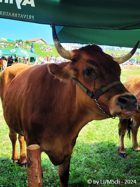 Fast ein jeder Bayer denkt bei diesen Zeilen an die bayrische Kultserie „Irgendwie und sowieso“ von Franz Xaver Bogner. Die berühmte Ochsenrennen-Szenerie mit Sir Quickly, in der sein Ochse Ringo nur Gas gibt wenn er den Song „Mr. Tambourine Man“, gespielt von den Byrds hört. Ein Ringo war heute leider nicht am Start und „Mr. Tambourine Man“ erschallte beim Rennen leider auch nicht aus den Lautsprechern. Die Münsinger Ochserer hatten nämlich eingeladen. Zum 7. Ochsenrennen, um genau zu sein. Nach acht Jahren Pause feierte man heute die Wiederauferstehung. So eine Gaudi fast quasi vor unserer Haustüre wollten wir uns natürlich nicht entgehen lassen. Münsing, eine kleine Gemeinde zwischen Wolfratshausen und dem Starnberger See gelegen, ist die Heimat der Münsinger Ochserer, und diese hatten sich nach der langen Pause auch mächtig ins Zeug gelegt. Beim letzten Rennen 2016 waren an die 10.000 Leute anwesend und es war zu erwarten, daß es dieses Mal wieder genau so viel sein dürften. Ein großes Bierzelt war direkt an der Naturarena neben der Holzhauserstraße aufgestellt und ein Programm für vier Tage Betrieb angelegt. Los gings bereits am Donnerstag, dem 29.8. mit dem Bieranstich und einer Trachtenmodenschau. Freitag feierte dann der Burschenverein Münsing seine Börsenfieber Party, welche am Tag drauf in einem zünftigen Weinfest ihre Fortsetzung fand, musikalisch untermalt von der Partyband Ois Chicago. Am Sonntag war es aber dann soweit – D’Münsinger Ochserer waren die Hausherren bei einem Spektakel, welches seinesgleichen sucht. Wir waren bei herrlichstem Wetter relativ früh da und parkten nicht allzu weit weg vom Zelt. Das Zelt selbst war zu der frühen Zeit bereits rammelvoll und wir suchten uns einen Platz im Freien. Leider standen die Biertischgarnituren sowas von eng beieinander, dass man nur mit Mühe an seinen Platz und wieder weg kam. Man musste teilweise dem Nachbartisch auf die Bank steigen … das müsste eigentlich nicht sein. Der gelösten allgemeinen Stimmung tat das aber keinen Abbruch und wir trafen uns mit unserem Mitschreiberling happytrails, alias Andi samt seiner besseren Hälfte Claudia an einem schattigen Tisch unter großen Schirmen. Schon bei Ankunft konnten wir hinter dem Zelt zwei der Ochsen bewundern, die anschließend beim Rennen mitlaufen sollten. Hermes hatte mir es angetan, mit seiner hohen Gestalt und dem tiefbraun glänzendem Fell. Auf ihn wollte ich später tippen, denn beim Kauf eines Festzeichens erwarb man gleichzeitig einen Tippschein zu einer Verlosung mit tollen Preisen, unter anderem einer Reise an die Nordsee. Die Leute strömten in Scharen herbei und die Plätze an der abgesteckten Arena füllten sich zusehends. Als erstes war aber die Viehschau angesagt. Im Zielbereich standen schön beschattet alle Ochsen samt ihren Jockeys und Besitzern. Da waren manche Prachtexemplare dabei. Hellmut mit seinem fast weißem Fell, der graue Ignaz, Beppo mit hellem Fell und Smoky-Eyes, Jacke, Bodo, Quattro (mit 4-Huf Antrieb), der schöne Hermes und viele weitere prachtvolle Tiere.