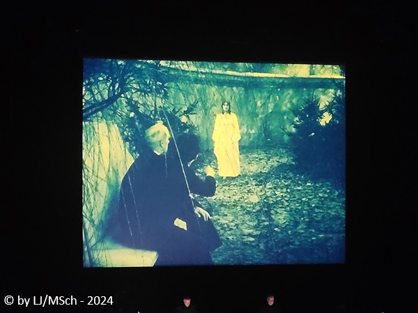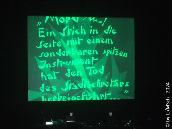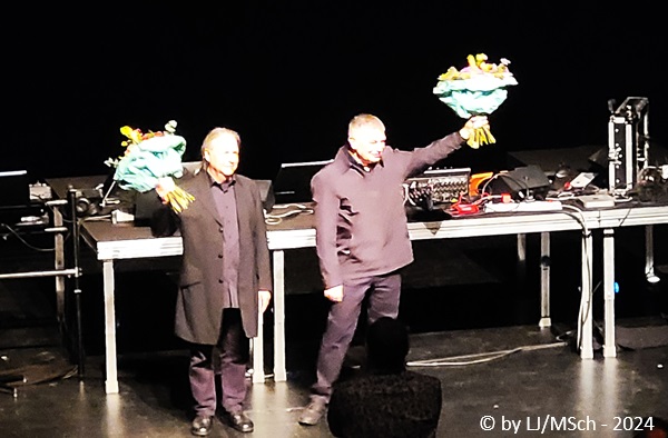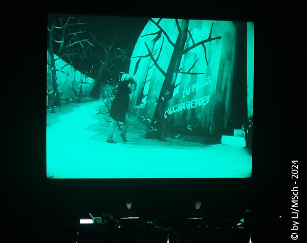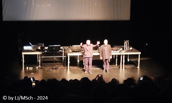 Die spartanische Bühne bestand lediglich aus einem längeren Tisch vor einer großen Leinwand, ausgestattet mit einigen Laptops und elektronischen Gerätschaften zur Tonerzeugung und Modulation – Kraftwerk lässt grüßen. Pünktlich um 20:00 Uhr ging es los. Bartos und Black, beide in schlichtem schwarz gekleidet betraten die Bühne und nahmen ihre Plätze hinter dem Tisch ein. Das Licht erlosch und die ersten Bilder erschienen. Unmerklich mischten sich die elektronischen Klänge zu den bewegten Bildern auf der Leinwand. Gebannt verfolgte das Publikum das Geschehen und alle stellten fest, dass sich ein 100 Jahre alter Film in keiner Weise mit elektronisch erzeugter Musik aneinander reibt. Es war nichts anderes als ein elektronisches Orchester, welches zum Film klang, als ob es im Jahr 1920 genauso gewollt gewesen wäre. Film und Musik verschmolzen perfekt ineinander. Das Erlebnis dauerte gute 80 Minuten, Karl Bartos und Mathias Black wurden bei stehenden Ovationen mit Blumensträußen verabschiedet. Kurze Zeit später kam Bartos noch zum Merchandise Stand um Gekauftes oder Mitgebrachtes zu signieren. Wohl um auf den Zuspruch zu reagieren, sind für Frühjahr 2025 zwei Zusatzkonzerte geplant, eines davon in München. Wir überlegen uns, nochmal hin zu gehen.
