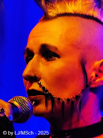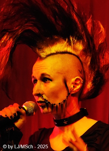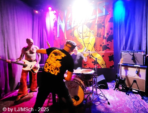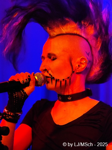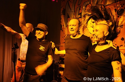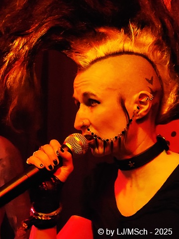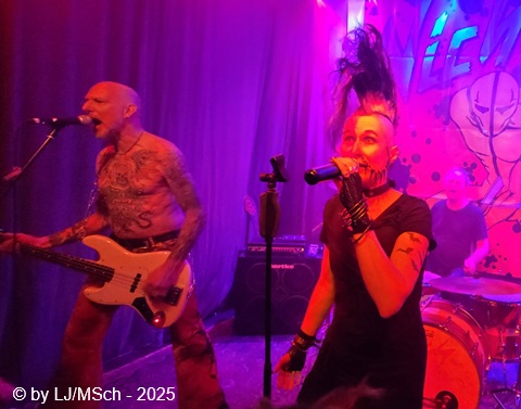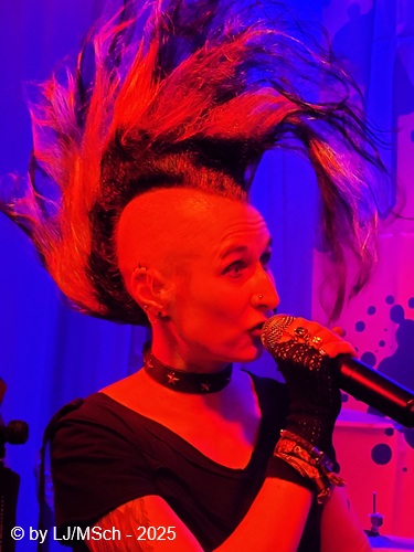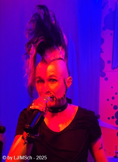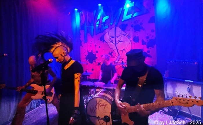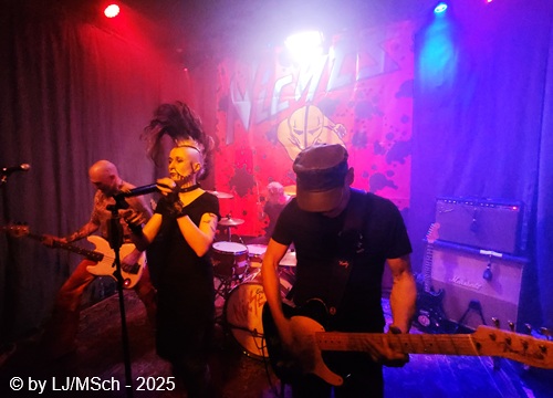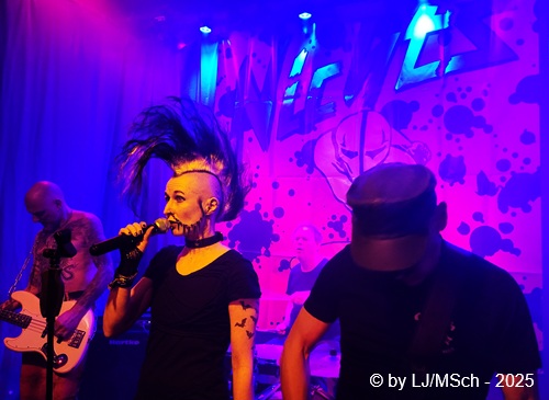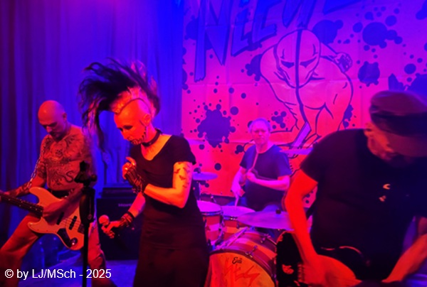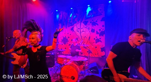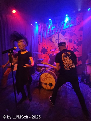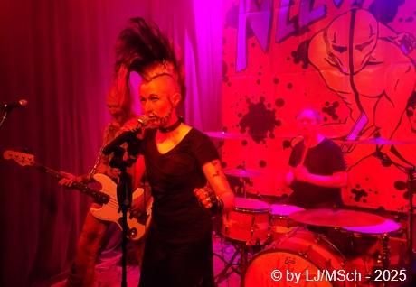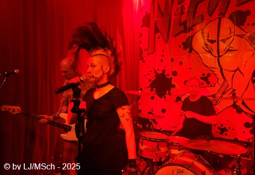 Dann aber wars endlich soweit und Drummer Matej Havranek, der 2024 eingestiegen ist, Basser Joachim Krämer, der bereits seit 2012 bei Nichts die dicken Saiten zupft, und Bandchef Meikel Clauss betraten die Bühne und legten los. „Schwarze Gedanken“ bildete den Auftakt eines Viererblocks vom 82er Tango 2000 Album. Ich war sehr gespannt, wie die neue Sängerin Nina H. live kingen würde. Auf ein paar nicht überragenden Livevideos auf YouTube hatte sie mich noch nicht überzeugt. Die Fußspuren von Andrea Mothes sind doch schon ziemlich groß. Optisch ist Nina H. eine imposante Erscheinung, was an ihrem Irokesenschnitt liegt, der gut 50 cm in die Höhe ragt und messerscharf in Fasson gebracht war. Spätests bei den drauffolgenden „Licht aus“, „Freitag der 13.“ und „Ein deutsches Lied“ zeigte sich aber deutlich, dass Nina H. perfekt zur Band passte. Der Vierer ist eine Einheit und brachte das auch knackig rüber. Das Publikum feierte Nichts mächtig ab und pogte mit. Bassist Joachim Krämer trug anstelle eines Gitarrengurtes seinen Fender an einer dicken Stahlkette um die Schultern. Eigentlich müssen seine Schulter und das Schlüsselbein ziemlich lädiert aussehen nach einem Konzert. Nach der Tango-LP war dann das Debüt an der Reihe und zwar wieder vier Songs hintereinander. „Eingeschlossen“, „Hallo Kartoffelsalat“, „Nichts“ und „10 Bier zuviel“ brachten die Stimmung noch weiter hoch, ehe mit „Die Gottesanbeterin“ das Reunions-Album Zeichen auf Sturm bedient wurde. Gleich folgend war dann „Allein zuhaus“ wieder das Debüt dran, ehe mit einem Dreierblock das aktuelle Album Tiefschwarz promotet und vorgestellt wurde. „Nitroglycerin“, „Mensch oder Maschine“ und „Kugel durch den Kopf“ fügten sich prächtig in den altbekannten Sound ein. Da war kein Unterschied feststellbar, weder musikalisch noch von der Stimmung bei den Leuten – das Level blieb hoch.
